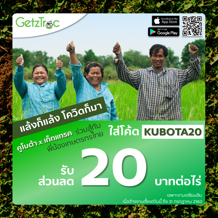 ได้แน่ได้ชัวร์ จัดไปเพื่อช่วยพี่น้องเกษตรกร ในช่วงนี้โดยเฉพาะ หมายเหตุ ไม่จำกัดจำนวนไร่ในการใช้ต่อครั้ง จำกัดการใช้ 1 ครั้งต่อสมาชิก รถให้บริการเฉพาะคูโบต้าเท่านั้น สำหรับงานเตรียมดินเท่านั้น (ไถดะ ไถพรวน ปั่นดิน) หมดเขต 31 กรกฎาคม 2563 หรือจนกว่าโควตาจะหมด